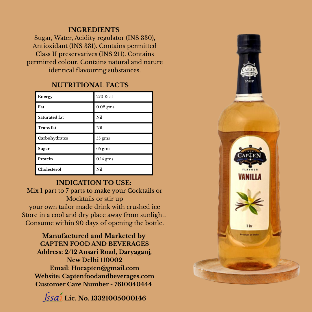 CAPTEN Vanilla Syrup For Coffee, Milkshake, Frappe, Cold-Coffee, Pancakes, Beverages & More | Concentrated Syrup | Ready To Mix 1L